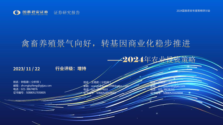 【国泰君安证券】【20231122】2024年农业投资策略:禽畜养殖景气向好,转基因商业化稳步推进-57页