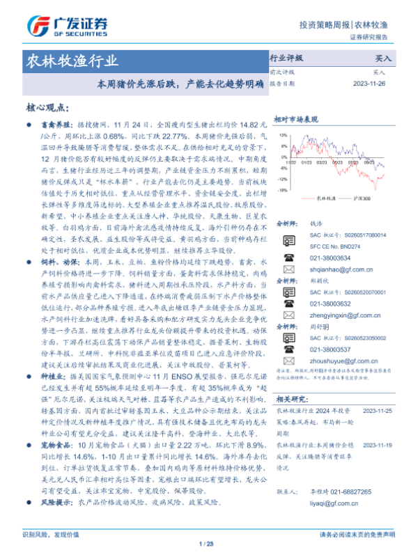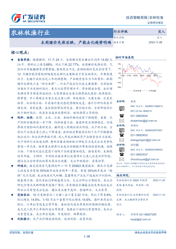 【广发证券】【20231126】20231126-广发证券-农林牧渔行业投资策略周报:本周猪价先涨后跌,产能去化趋势明确-23页