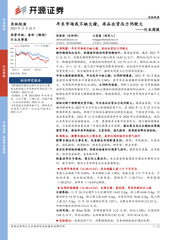 【开源证券】【20231126】20231126-开源证券-农林牧渔行业周报:年末市场或不缺大猪,冻品出货压力仍较大-12页