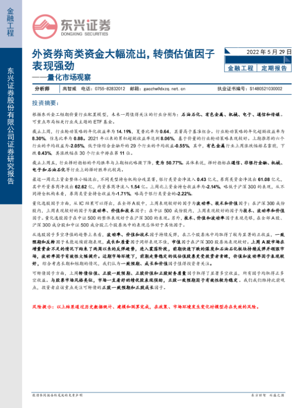 【东兴证券】【20220529】量化市场观察:外资券商类资金大幅流出,转债估值因子表现强劲-20页