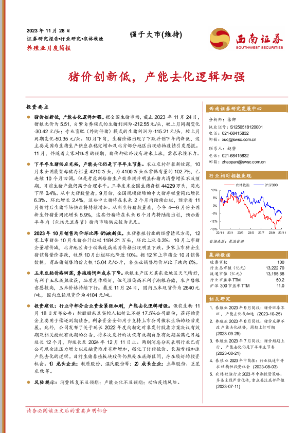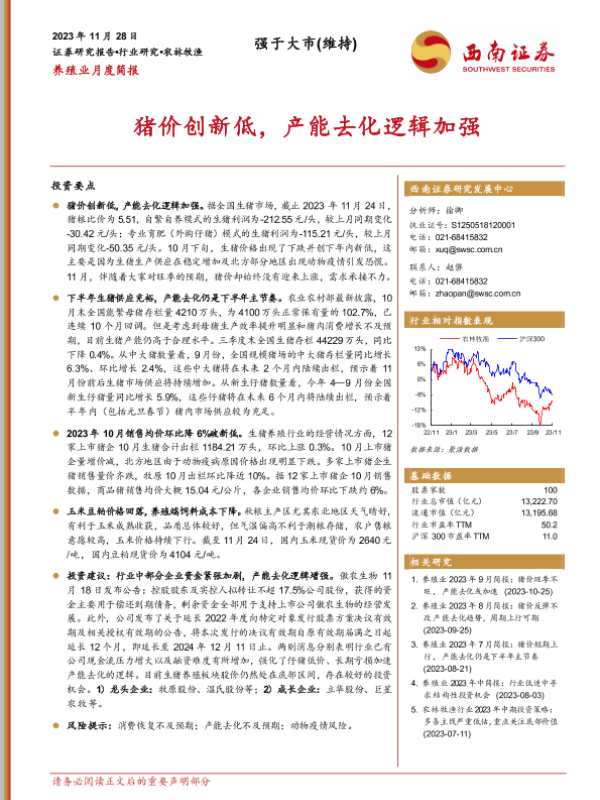 【西南证券】【20231128】20231128-西南证券-养殖业月度简报:猪价创新低,产能去化逻辑加强-11页