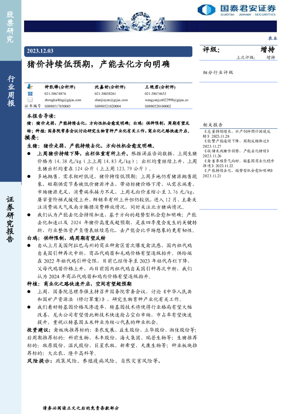 【国泰君安证券】【20231203】20231203-国泰君安-农业行业周报:猪价持续低预期,产能去化方向明确-10页