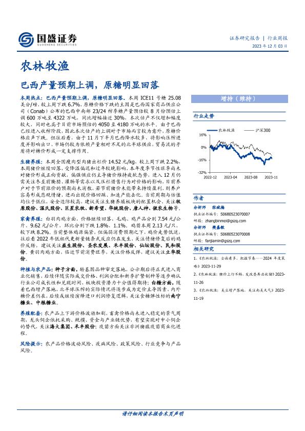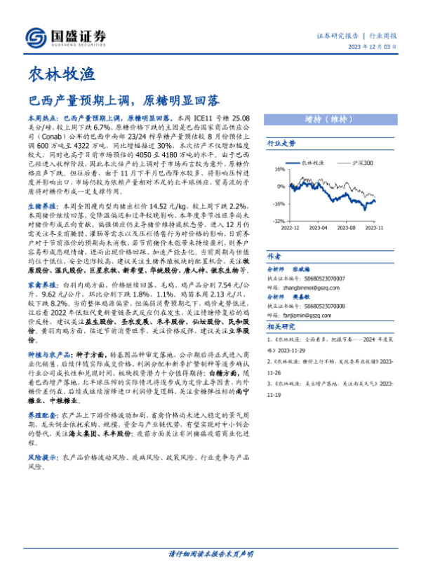 【国盛证券】【20231203】农林牧渔行业周报:巴西产量预期上调,原糖明显回落-12页