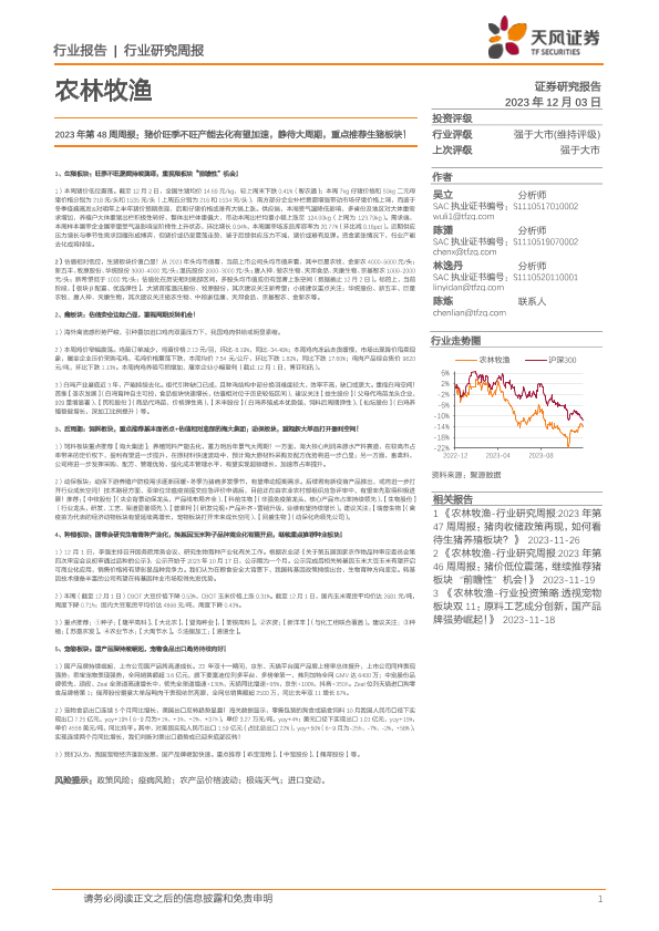 【天风证券】【20231203】农林牧渔2023年第48周周报:猪价旺季不旺产能去化有望加速,静待大周期,重点推荐生猪板块!-15页