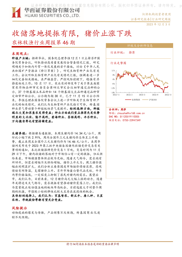 【华西证券】【20231203】农林牧渔行业周报第46期:收储落地提振有限,猪价止涨下跌-25页