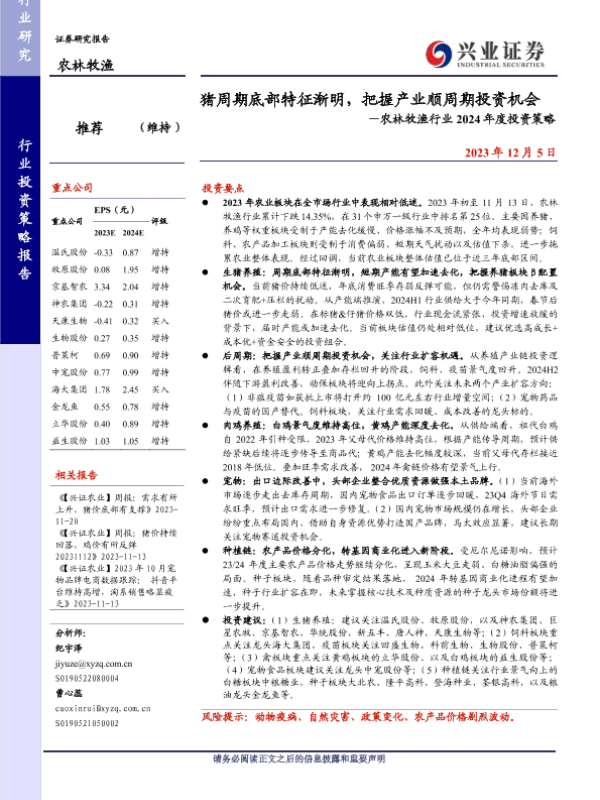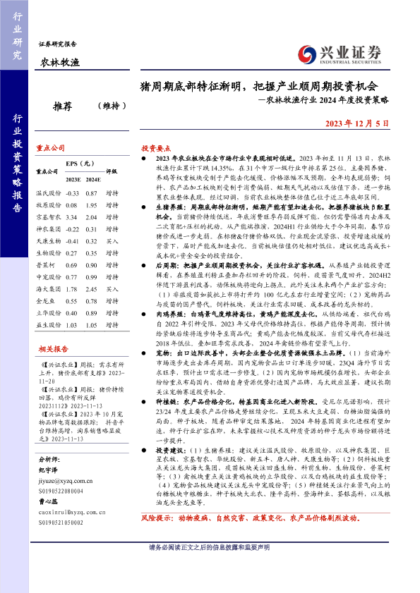 【兴业证券】【20231205】猪周期底部特征渐明,把握产业顺周期投资机会—农林牧渔行业2024年度投资策略-48页