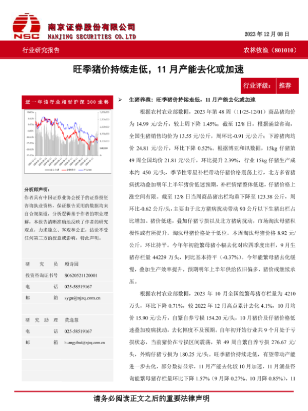 【南京证券】【20231208】20231208-南京证券-农林牧渔:旺季猪价持续走低,11月产能去化或加速-10页
