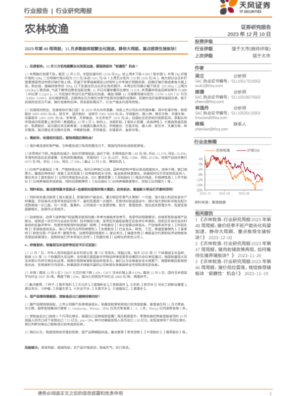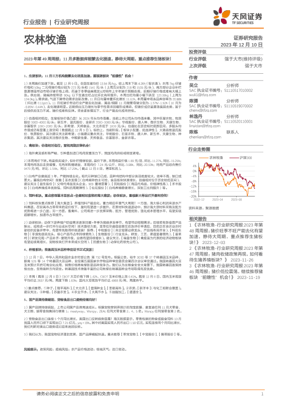 【天风证券】【20231210】农林牧渔2023年第49周周报:11月多数据库能繁去化提速,静待大周期,重点推荐生猪板块!-14页