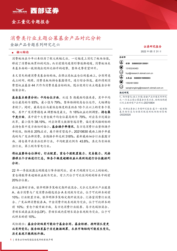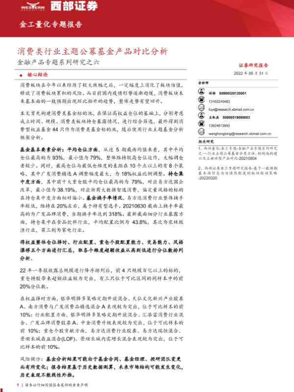 【西部证券】【20220531】金融产品专题系列研究之六:消费类行业主题公募基金产品对比分析-22页