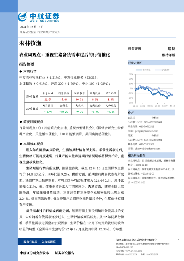 【中航证券】【20231216】农业周观点:重视生猪备货需求过后的行情催化-13页
