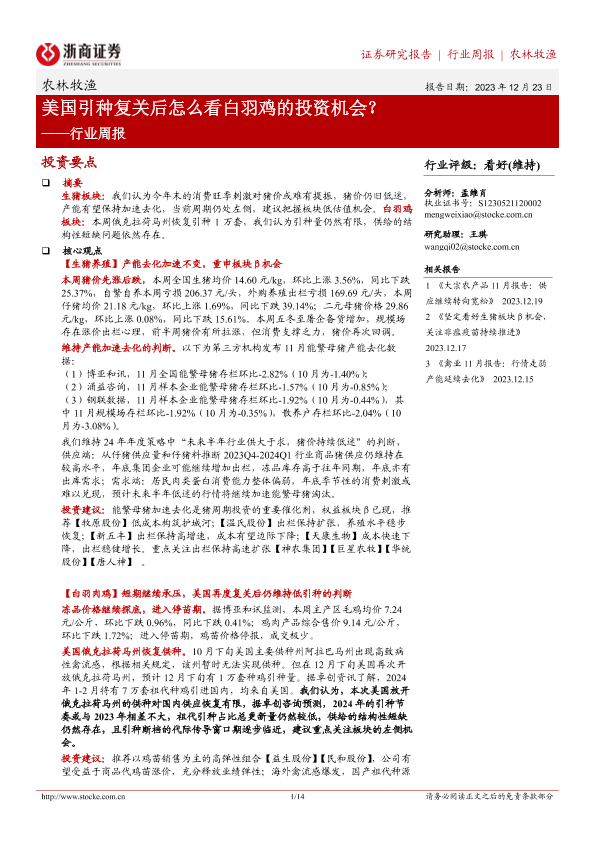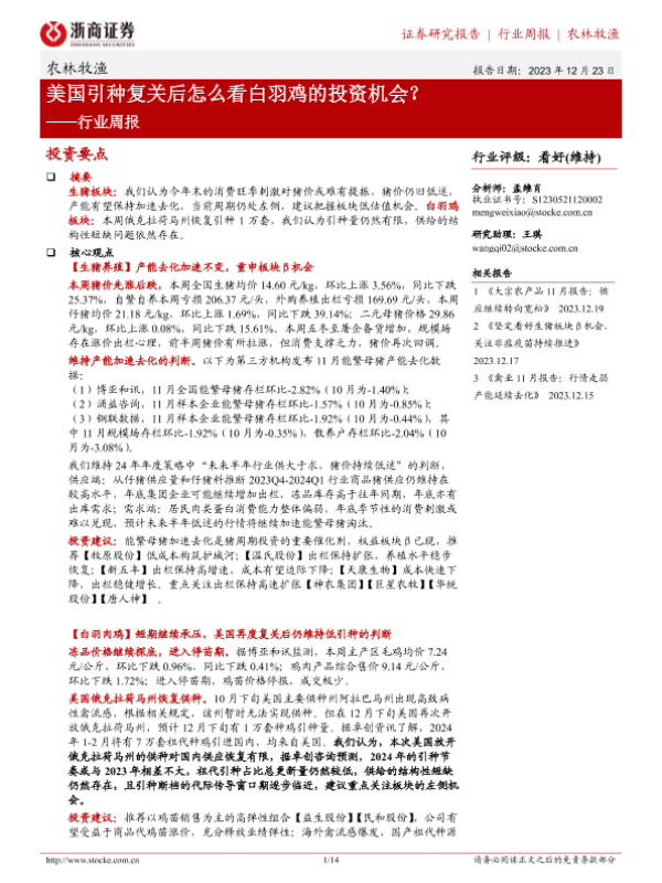 【浙商证券】【20231223】20231223-浙商证券-农林牧渔行业周报:美国引种复关后怎么看白羽鸡的投资机会?-14页