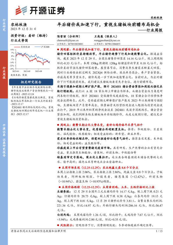 【开源证券】【20231231】20231231-开源证券-农林牧渔行业周报:年后猪价或加速下行,重视生猪板块前瞻布局机会-13页