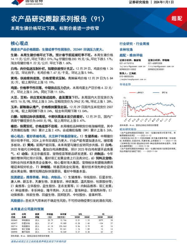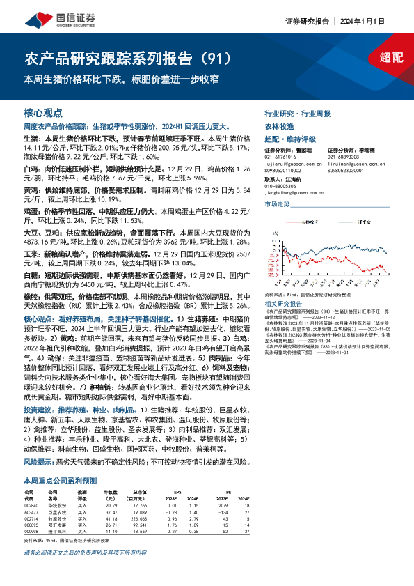 【国信证券】【20240101】20240101-国信证券-农产品研究跟踪系列报告(91):本周生猪价格环比下跌,标肥价差进一步收窄-25页