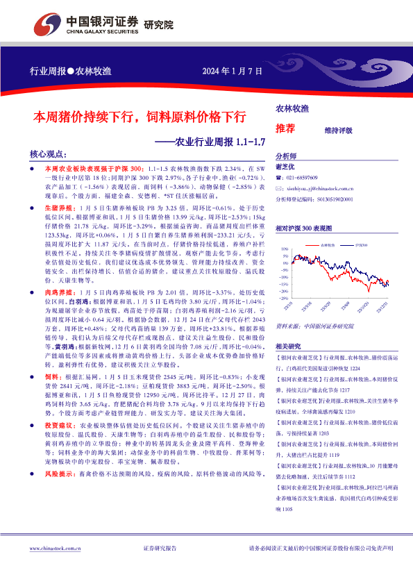 【银河证券】【20240107】20240107-中国银河-农业行业周报:本周猪价持续下行,饲料原料价格下行-15页