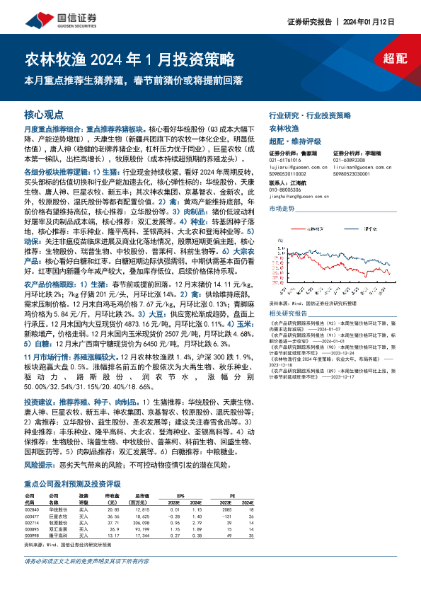 【国信证券】【20240112】2024年1月投资策略:本月重点推荐生猪养殖,春节前猪价或将提前回落-20页