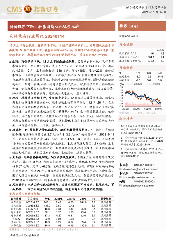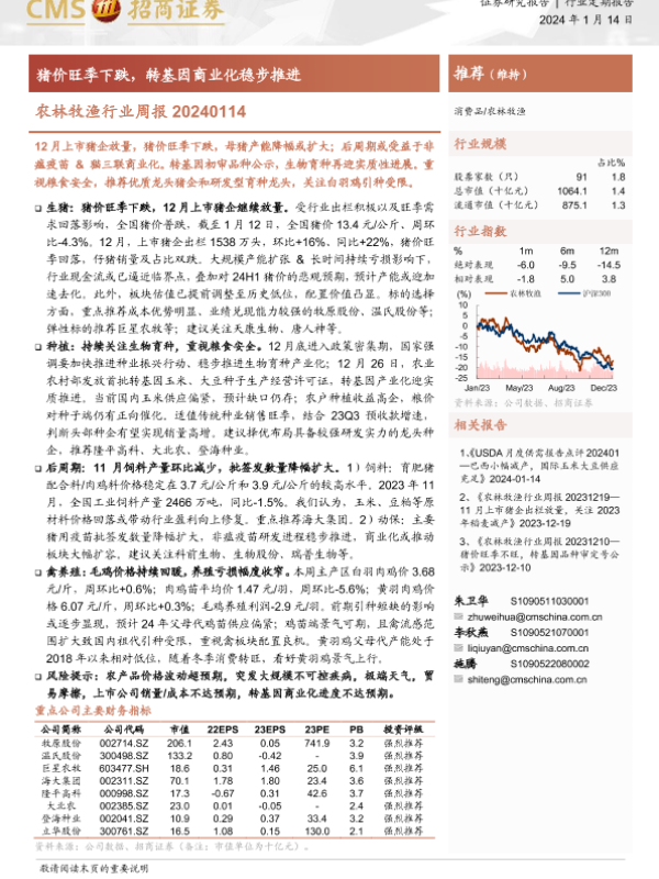 【海通证券】【20240114】20240114-招商证券-农林牧渔行业周报:猪价旺季下跌,转基因商业化稳步推进-16页