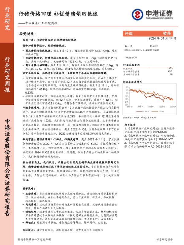 【申港证券】【20240114】20240114-申港证券-农林牧渔行业研究周报:仔猪价格回暖 补栏情绪依旧低迷-13页