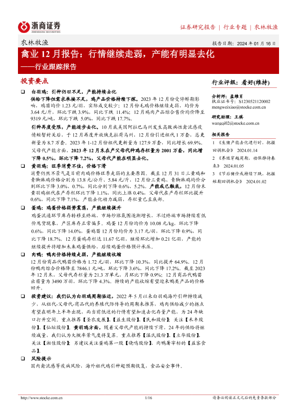 【浙商证券】【20240116】20240116-浙商证券-禽业12月报告:行情继续走弱,产能有明显去化-16页