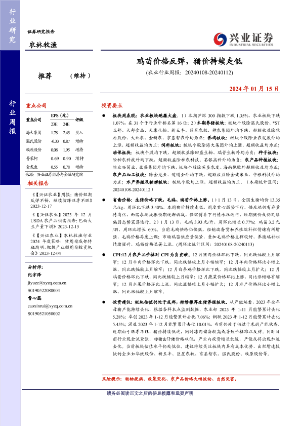【兴业证券】【20240115】20240115-兴业证券-农业行业周报:鸡苗价格反弹,猪价持续走低-16页