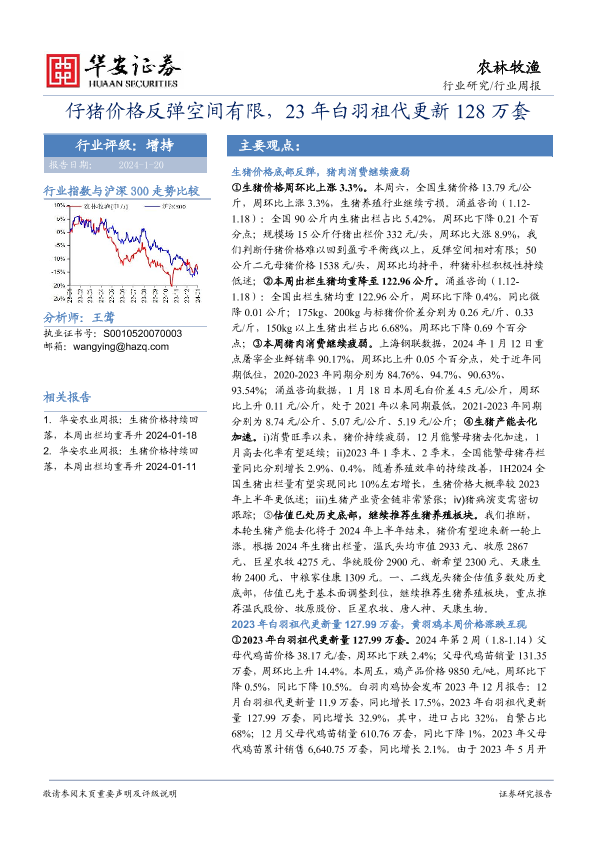 【华安证券】【20240120】20240120-华安证券-农林牧渔行业周报:仔猪价格反弹空间有限,23年白羽祖代更新128万套-42页