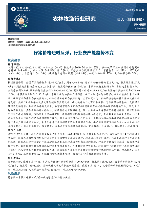 【国金证券】【20240121】20240121-国金证券-农林牧渔行业研究:仔猪价格短时反弹,行业去产能趋势不变-14页