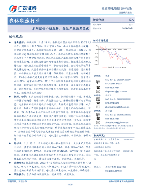 【广发证券】【20240121】20240121-广发证券-农林牧渔行业投资策略周报:本周猪价小幅反弹,关注产业预期变化-25页