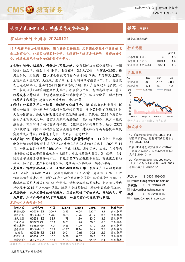 【海通证券】【20240121】农林牧渔行业周报:母猪产能去化加速,转基因再发安全证书-16页