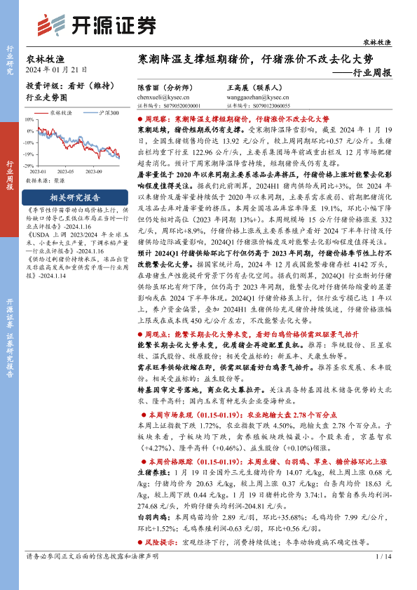 【开源证券】【20240121】20240121-开源证券-农林牧渔行业周报:寒潮降温支撑短期猪价,仔猪涨价不改去化大势-14页