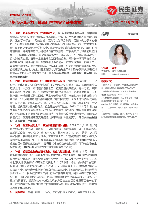 【民生证券】【20240122】20240122-民生证券-农林牧渔行业周报:猪价反弹乏力;转基因生物安全证书发放-17页