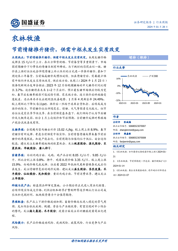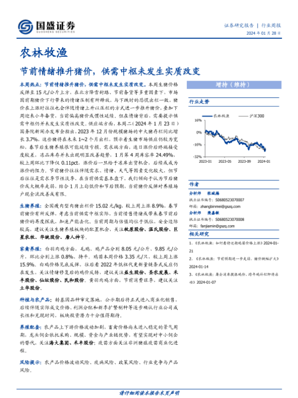 【国盛证券】【20240128】20240128-国盛证券-农林牧渔行业周报:节前情绪推升猪价,供需中枢未发生实质改变-13页