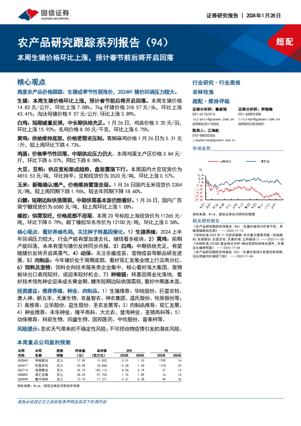 【国信证券】【20240128】20240128-国信证券-农产品研究跟踪系列报告(94):本周生猪价格环比上涨,预计春节前后将开启回落-27页