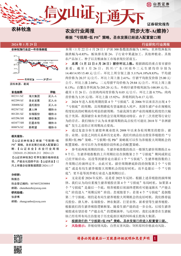 【山西证券】【20240129】农业行业周报:根据“亏损期+低PB”策略,圣农发展已经进入配置窗口期-19页