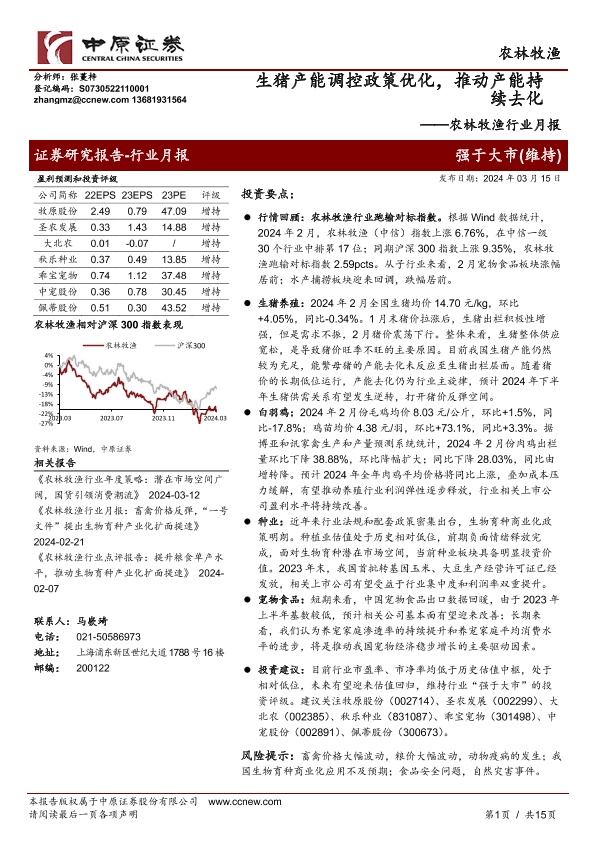 【中原证券】【20240315】20240315-中原证券-农林牧渔行业月报:生猪产能调控政策优化,推动产能持续去化-15页