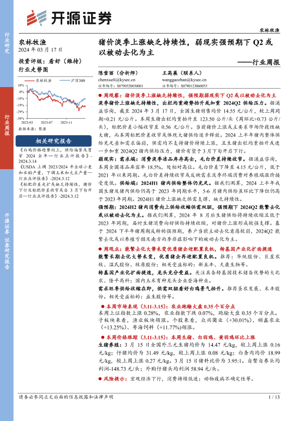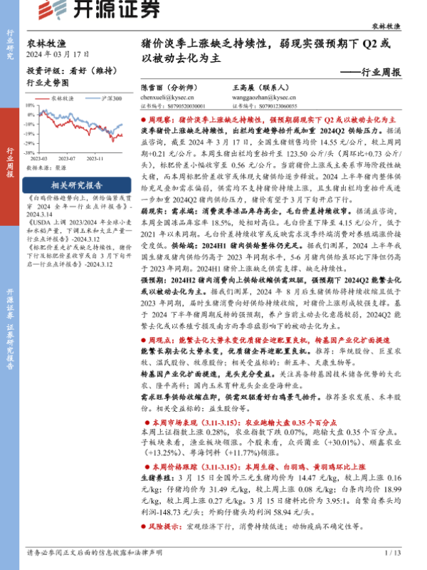 【开源证券】【20240317】农林牧渔行业周报:猪价淡季上涨缺乏持续性,弱现实强预期下Q2或以被动去化为主-13页