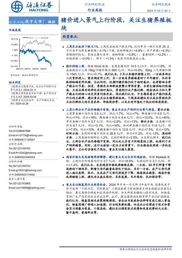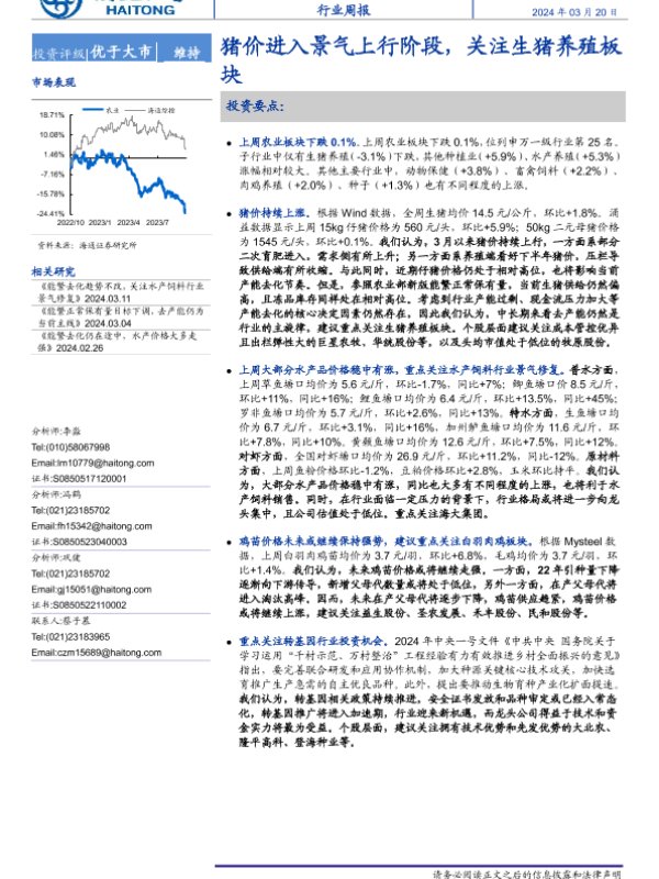【海通证券】【20240320】20240320-海通证券-农业行业周报:猪价进入景气上行阶段,关注生猪养殖板块-11页