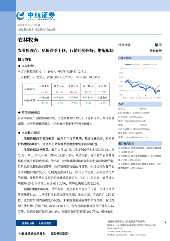【中航证券】【20240323】农业周观点:猪价淡季上扬,行情趋势向好,增配板块-13页