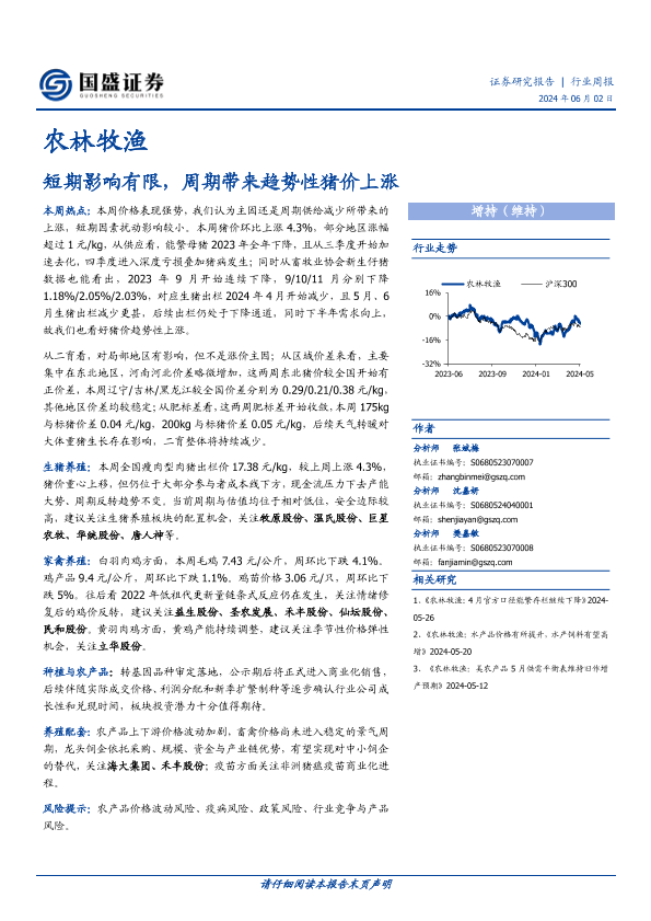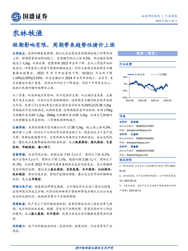 【国盛证券】【20240602】20240602-国盛证券-农林牧渔行业周报:短期影响有限,周期带来趋势性猪价上涨-13页