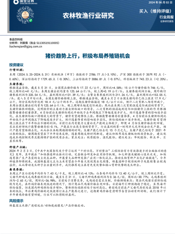 【国金证券】【20240602】20240602-国金证券-农林牧渔行业周报:猪价趋势上行,积极布局养殖链机会-13页