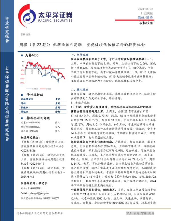 【太平洋证券】【20240602】20240602-太平洋-农林牧渔周报(第22期):养猪业盈利高涨,重视板块低估值品种的投资机会-17页
