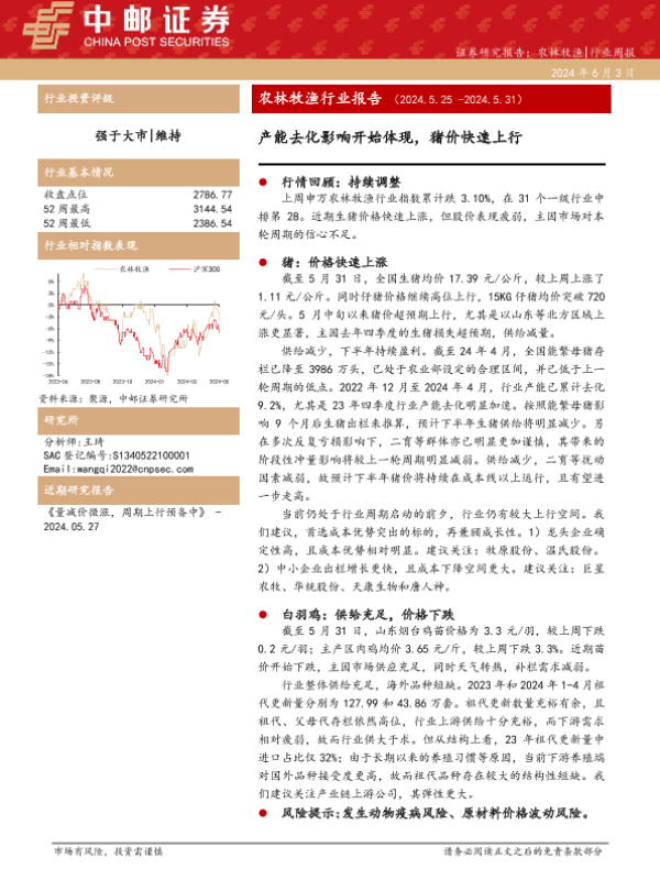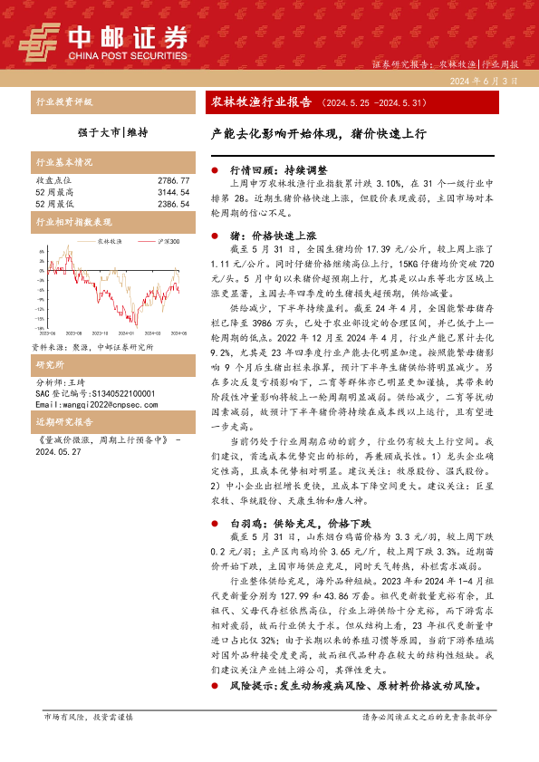 【中邮证券】【20240603】20240603-中邮证券-农林牧渔行业报告:产能去化影响开始体现,猪价快速上行-12页