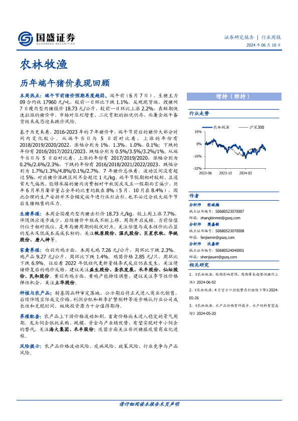 【国盛证券】【20240610】20240610-国盛证券-农林牧渔行业周报:历年端午猪价表现回顾-13页