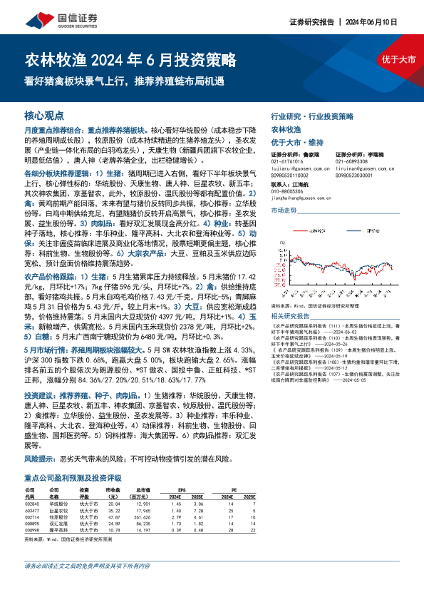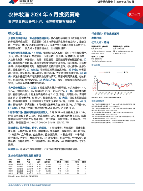【国信证券】【20240610】2024年6月投资策略:看好猪禽板块景气上行,推荐养殖链布局机遇-20页