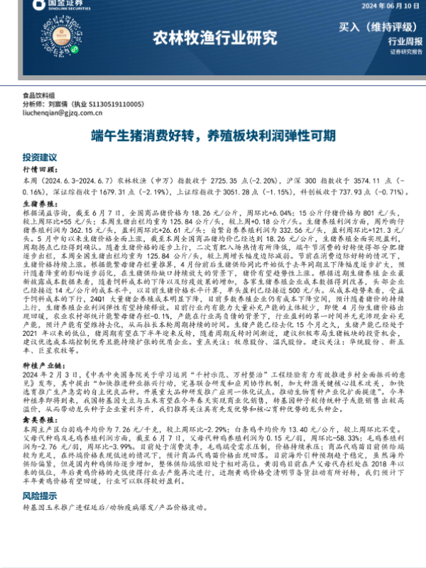 【国金证券】【20240610】20240610-国金证券-农林牧渔行业周报:端午生猪消费好转,养殖板块利润弹性可期-14页