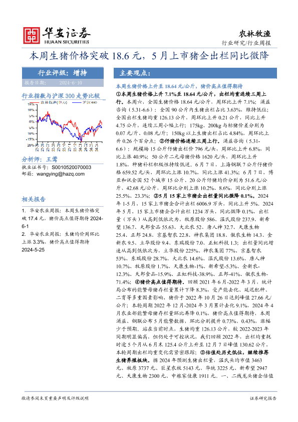 【华安证券】【20240610】20240610-华安证券-农林牧渔行业周报:本周生猪价格突破18.6元,5月上市猪企出栏同比微降-37页