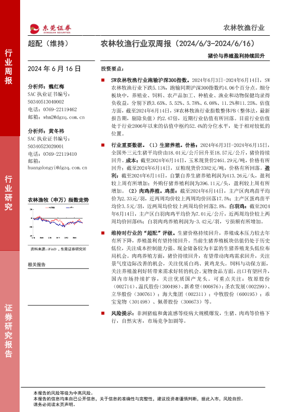 【东莞证券】【20240616】农林牧渔行业双周报:猪价与养殖盈利持续回升-10页