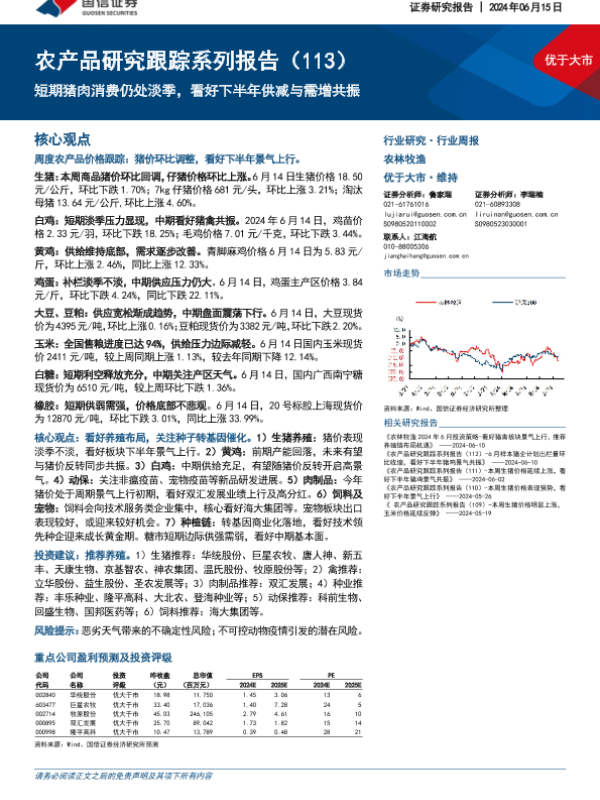 【国信证券】【20240615】20240615-国信证券-农产品研究跟踪系列报告(113):短期猪肉消费仍处淡季,看好下半年供减与需增共振-26页