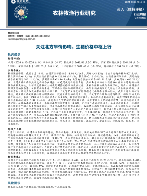 【国金证券】【20240616】20240616-国金证券-农林牧渔行业周报:关注北方旱情影响,生猪价格中枢上行-15页
