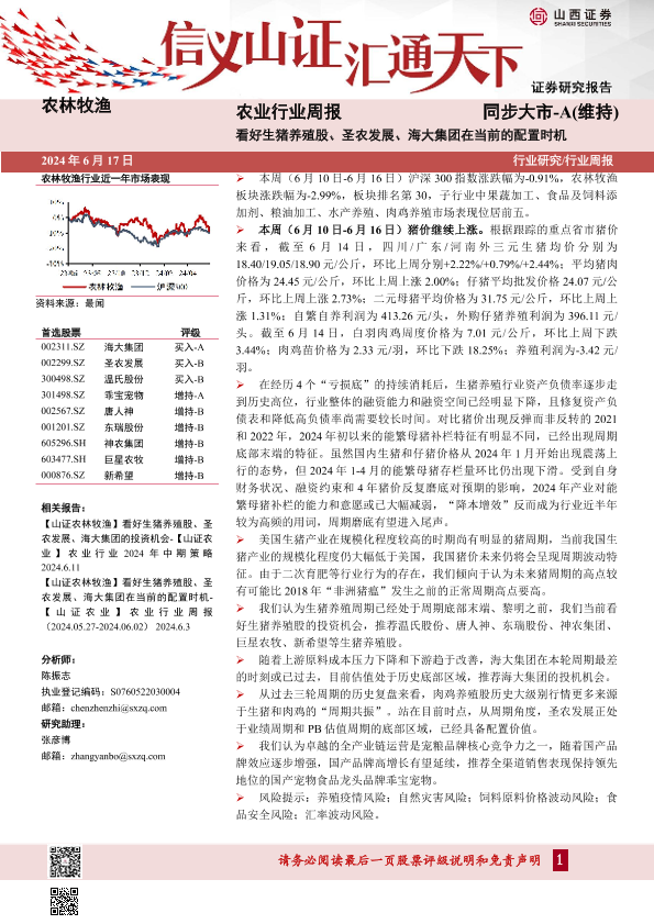 【山西证券】【20240617】农业行业周报:看好生猪养殖股、圣农发展、海大集团在当前的配置时机-20页