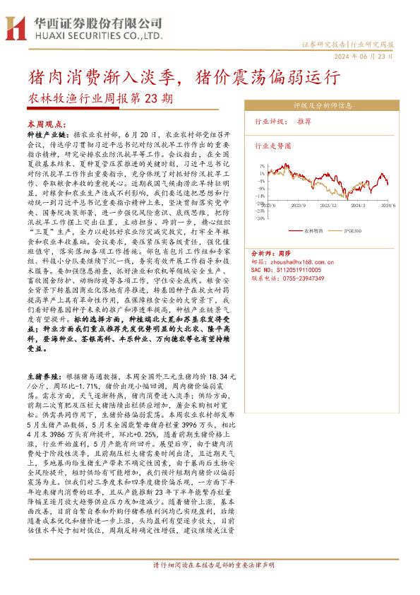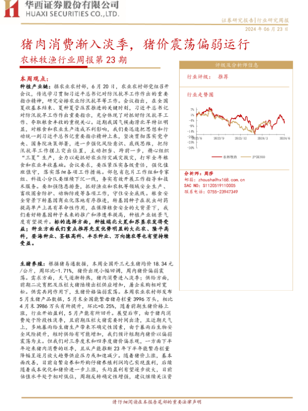 【华西证券】【20240623】20240623-华西证券-农林牧渔行业周报第23期:猪肉消费渐入淡季,猪价震荡偏弱运行-25页