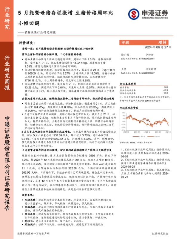 【申港证券】【20240627】20240627-申港证券-农林牧渔行业研究周报:5月能繁母猪存栏微增,生猪价格周环比小幅回调-14页